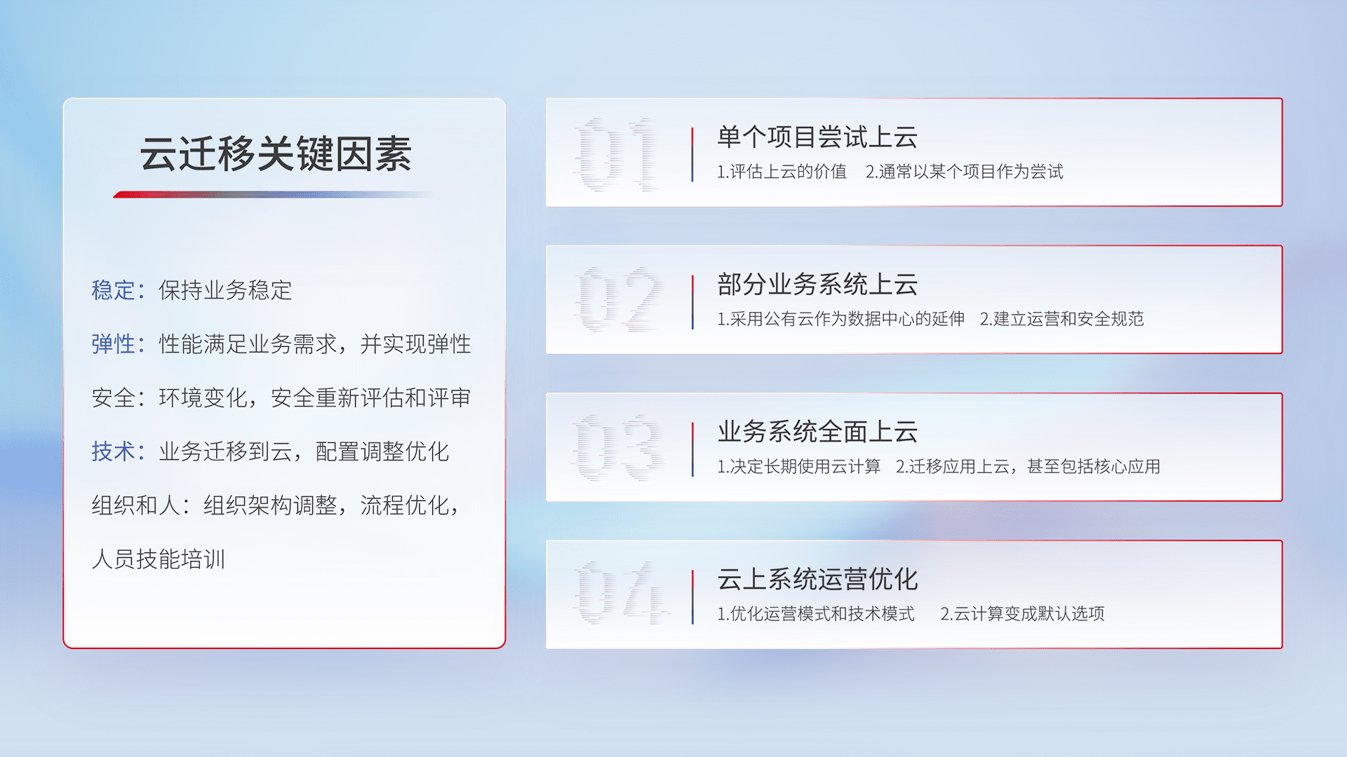 结合实际业务,,,,从规划设计、、、云平台选型、、、云原生改造、、数据迁移、、、、集成交付,,迁移全过程为客户识别最佳上云路径,,做好风险识别管理,,设计网络架构、、身份权限、、、、安全审计合规、、操作审计、、、日志审计、、、监控告警策略、、、多站点容灾设计等,,对云上基础设施进行整体规划,,,,提升IT治理水平,,,以满足弹性、、、高可用、、、高性能的需求。。