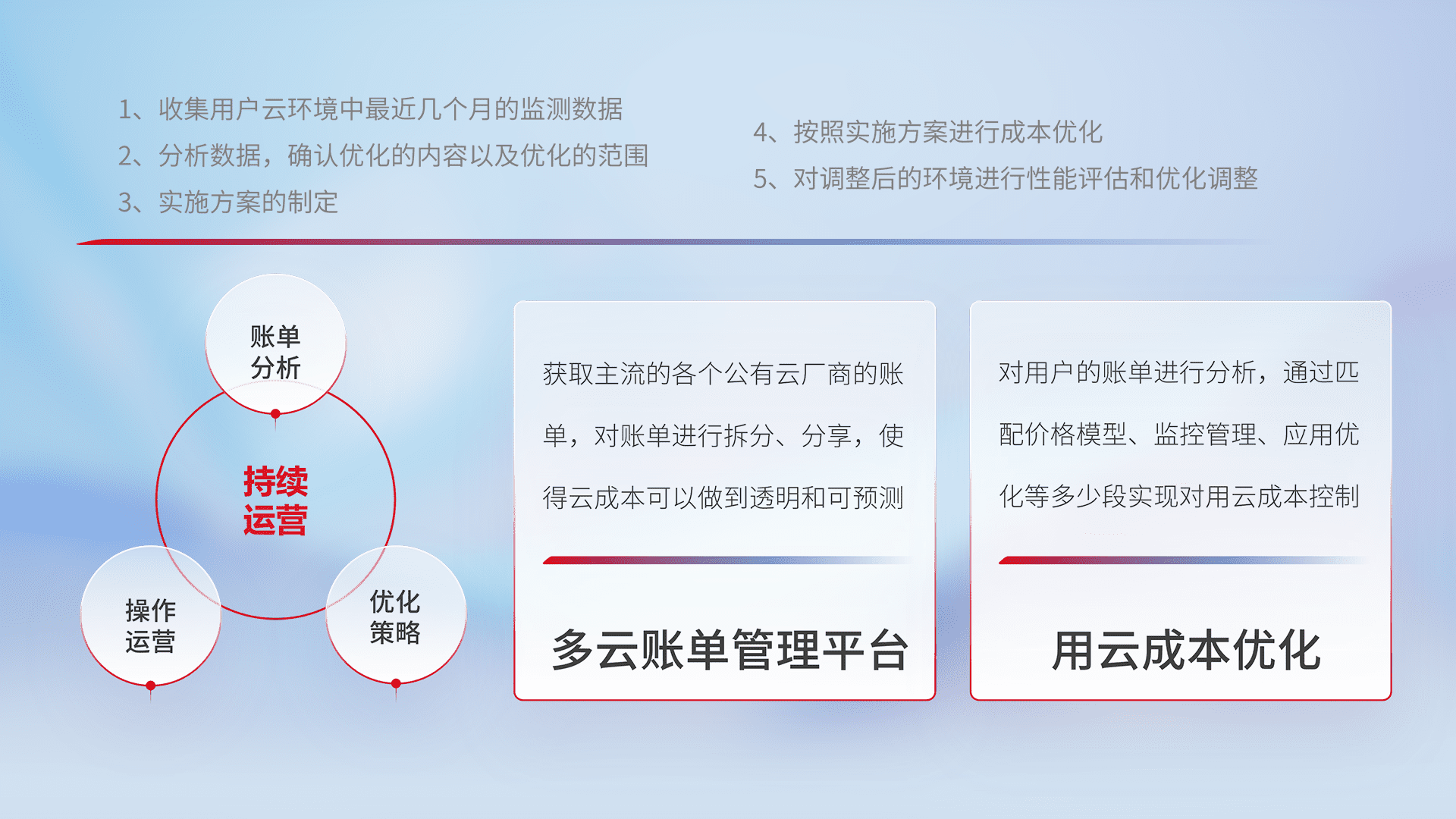 通过多云纳管,,,,以统一的资源数据模型把客户的云资源进行抽象和封装,,进而实现对多云资源的统一操作,,保障云资源管理的可靠性、、、稳定性与可用性。。。量身定制化运维内容,,配置、、开发运维、、、、补丁管理、、、、备份、、、、监控、、认证和访问管理、、、、审计和日常巡检等,,,保障在用云过程中的可靠度,,稳定度以及高可用率。。