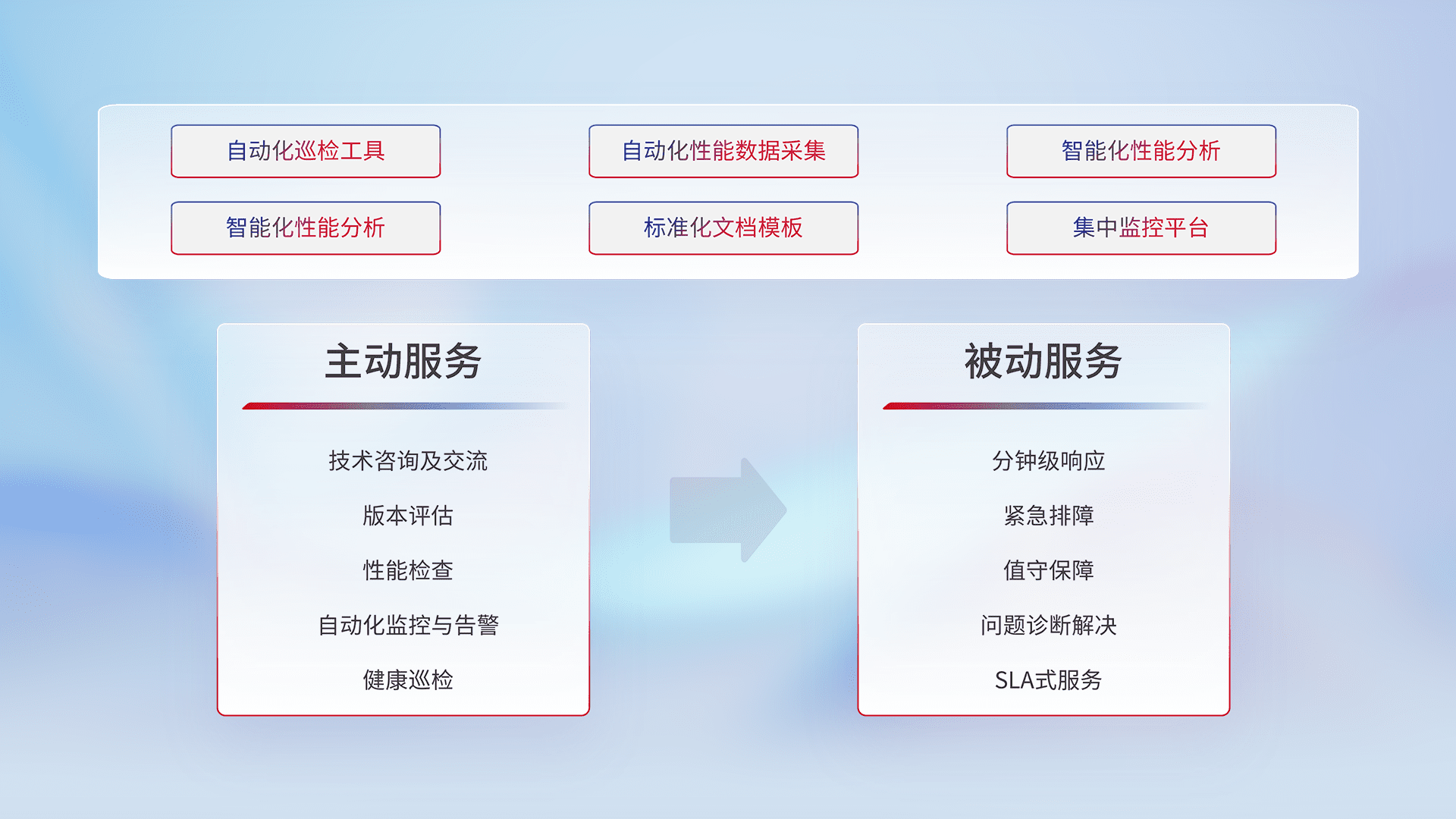 智能化工具和标准化文档,,保障服务质量,,提供主动服务(包含技术咨询、、、、版本评估、、、、性能检查、、自动化监控与告警、、健康巡检)和被动服务包含(分钟级响应、、紧急排障、、、、值守保障、、问题诊断解决、、、SLA服务)。。。